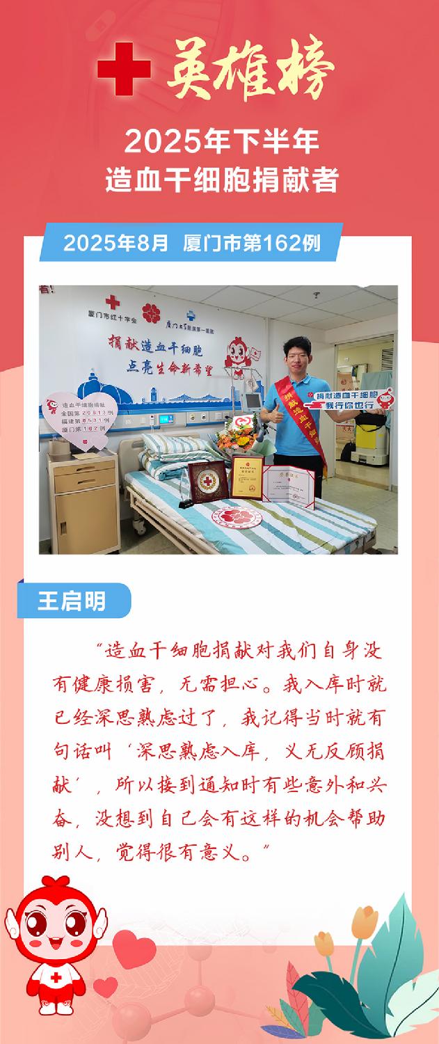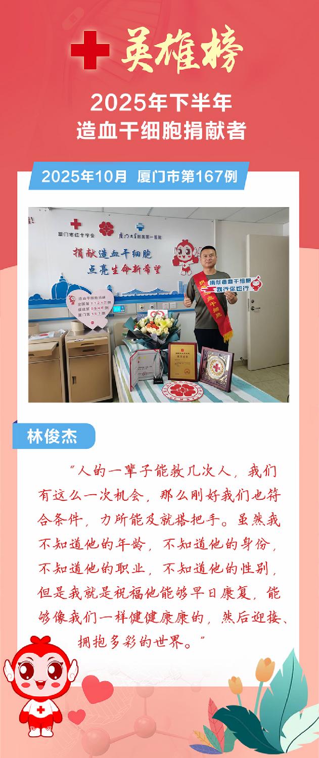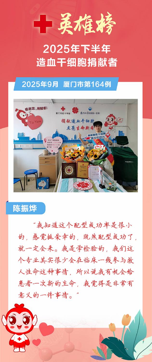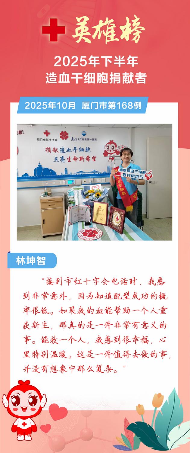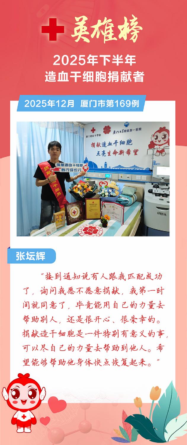 今年下半年,爱的火种继续燎原,又有9位平凡的英雄挽袖前行,用热血点亮生命之光。截至12月底,我市2025年造血干细胞捐献总数达到21例,创历史新高!这份突破性的年度成绩单,见证了爱心力量的蓬勃汇聚与生命接力的坚实步伐,铸就了厦门这座城市最温暖的年度记忆。