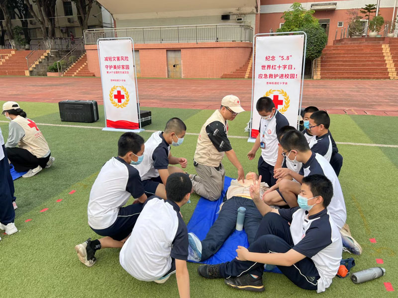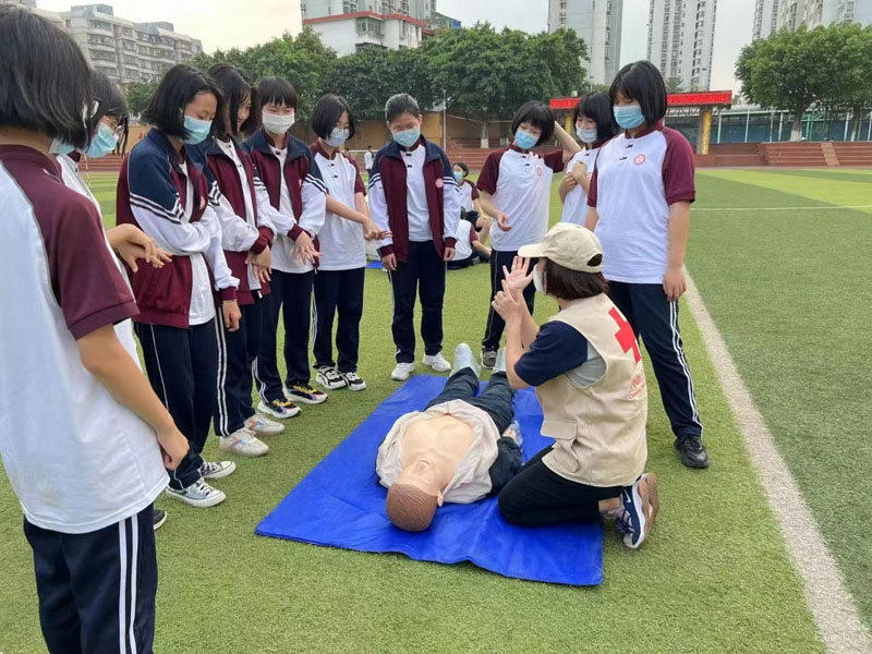 (2)4月27日,杏林街道红十字会结合纪念“5.8”世界红十字日及第十四个全国“防灾减灾日”,进十中校园开展心肺复苏培训,培训人数106人,充分利用社区现有人体模具十一具,诚邀社区持初级救护证人员做为指导老师,让持证人员学以致用,让孩子们掌握急救技能。